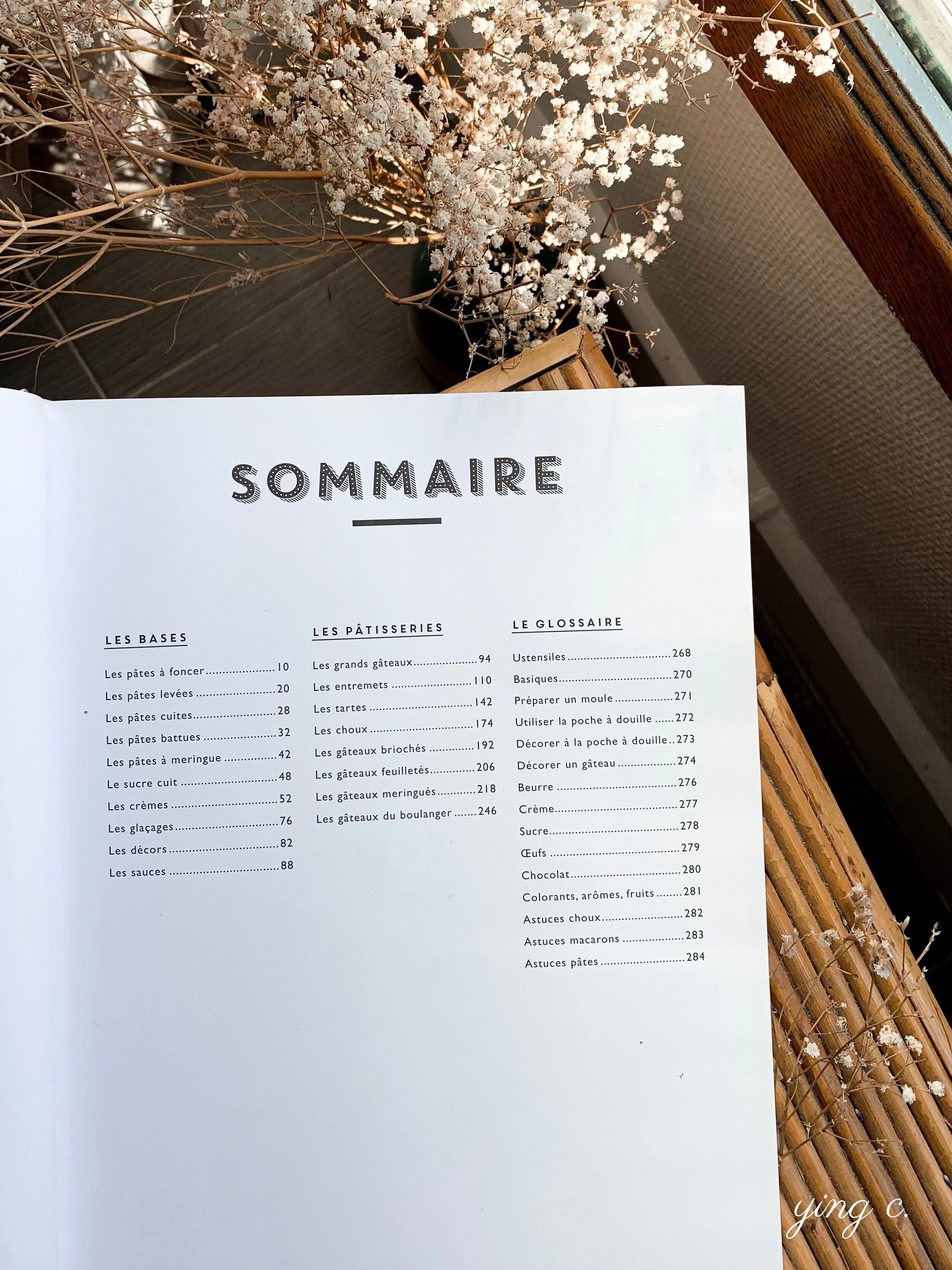 《Le grand manuel du pâtissier》的目錄,左手邊第一欄是基礎元素(les bases)、中間是各種類別的甜點(les pâtisseries)、最後一欄則是索引(le glossaire)。