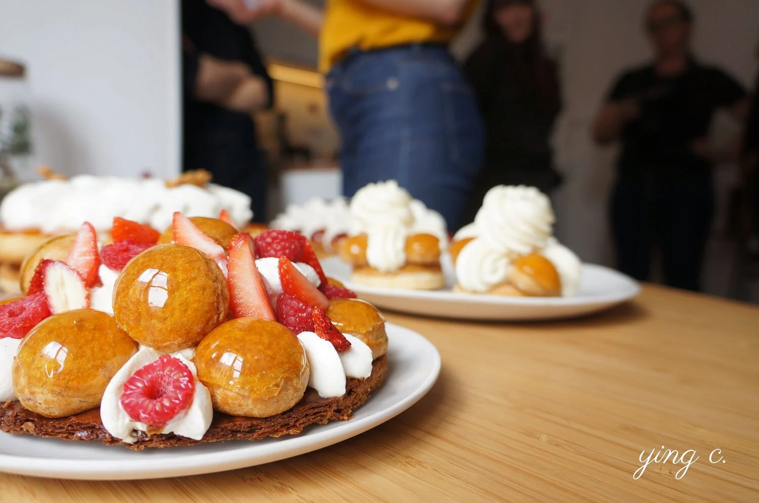 Yann Couvreur 主廚的「Saint-Honoré aux fruits rouges」(紅莓果聖多諾黑),是由千層派皮加上泡芙(中間填入奶餡、外層以焦糖裝飾)、香緹鮮奶油與新鮮紅莓果製作而成。