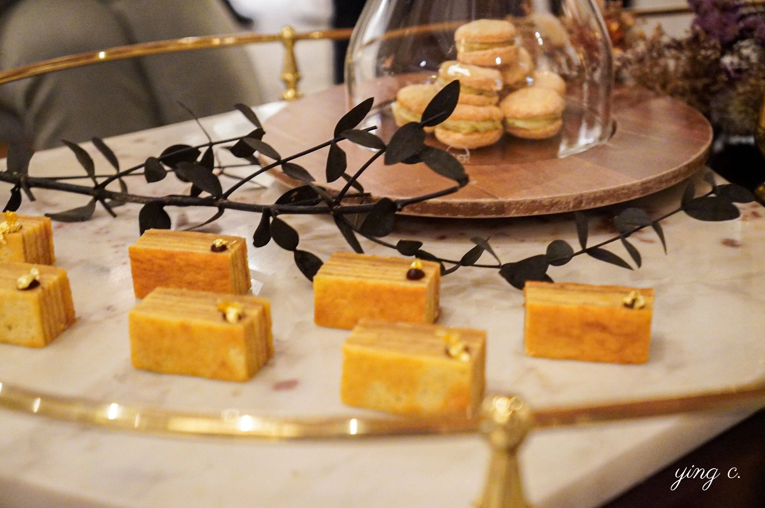 甜點推車上的各種小點。前方便是從客家「九層粿」演變而來的「千層蛋糕」。