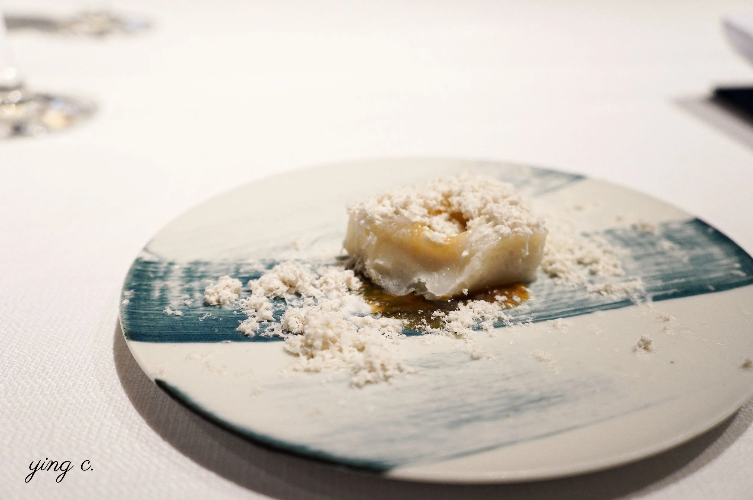 愛玉是台灣夏季常見涼飲,但 Angela 加上了香茅與薑的凝膠增添南洋味,外面再以法式甜點常見的蛋白霜殼包覆、外層撒上青檸皮,更添香氣。扼腕的是我拍照與錄影花了一些時間,蛋白霜不敵台灣的濕度,在數分鐘內就變得濕軟。這是在台灣做法式甜點的硬傷,只可惜連累對面和我分食的九日風主廚 Danny。