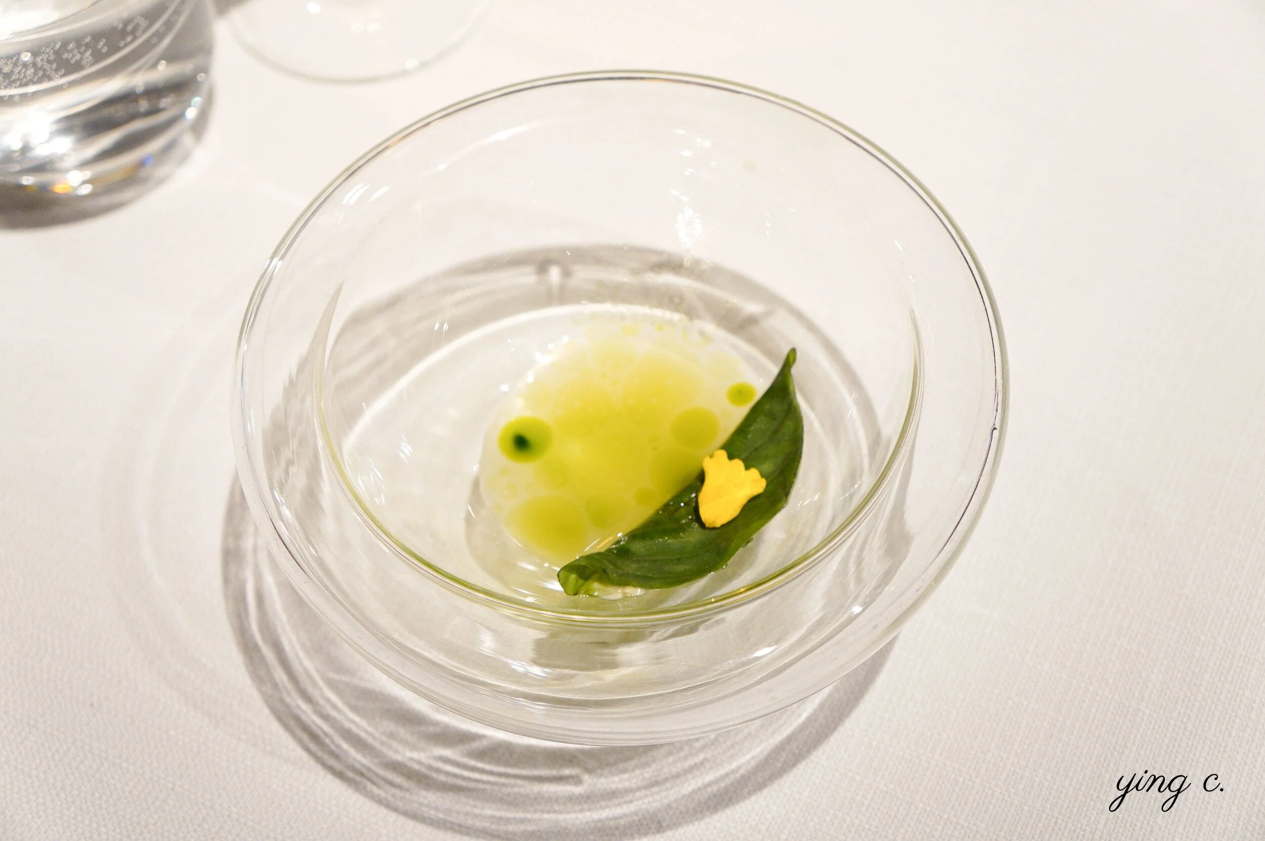 這是本次餐會中,最令我感到印象深刻的一道作品之一。結合台灣檳榔與新加坡小印度區以檳榔葉(betel leaf)包裹食材的飲食方法,以九層塔葉包裹著碳燒金桔乳霜,佐以由昆布、金桔果汁、金桔胡椒(將柚子胡椒置換)、糖製作的金桔冷湯與開心果泥、羅勒油。金桔與九層塔的組合個性強烈、風味明亮,冷湯的鹹味也明顯,但昆布與糖卻給了溫婉的支撐,這是溫帶地區餐桌上難以尋得的迷人風情。
