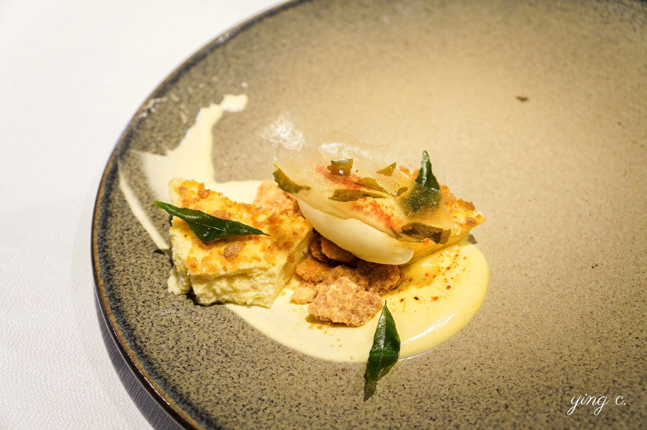 以台灣的「鹹蛋糕」、新加坡「粿」為靈感打造的「蝦米、鹹蛋黃、鳳梨」主甜點,一上桌就有股潮香暗湧而來,原來是鹹蛋糕中藏有蝦米。蛋糕本身濕潤柔軟,毫無一般法式鹹蛋糕(cake salé)中過重的鹼味、搭配鹹蛋黃方塊酥碎片的香脆酥鬆,佐以香甜滑潤的貝禮詩奶酒沙巴雍奶醬(Bailey’s sabayon),猶如台式沙拉醬再現,的確確是本地口味;但上頭冰涼的鳳梨雪酪,清爽酸香中藏著比七味粉更潑辣的辣椒粉,又讓人想起印度chutney,再加上最後的鳳梨咖哩葉脆片,口中彷彿藏著整個南洋。這是一道令人想要拍手叫好的精彩作品。