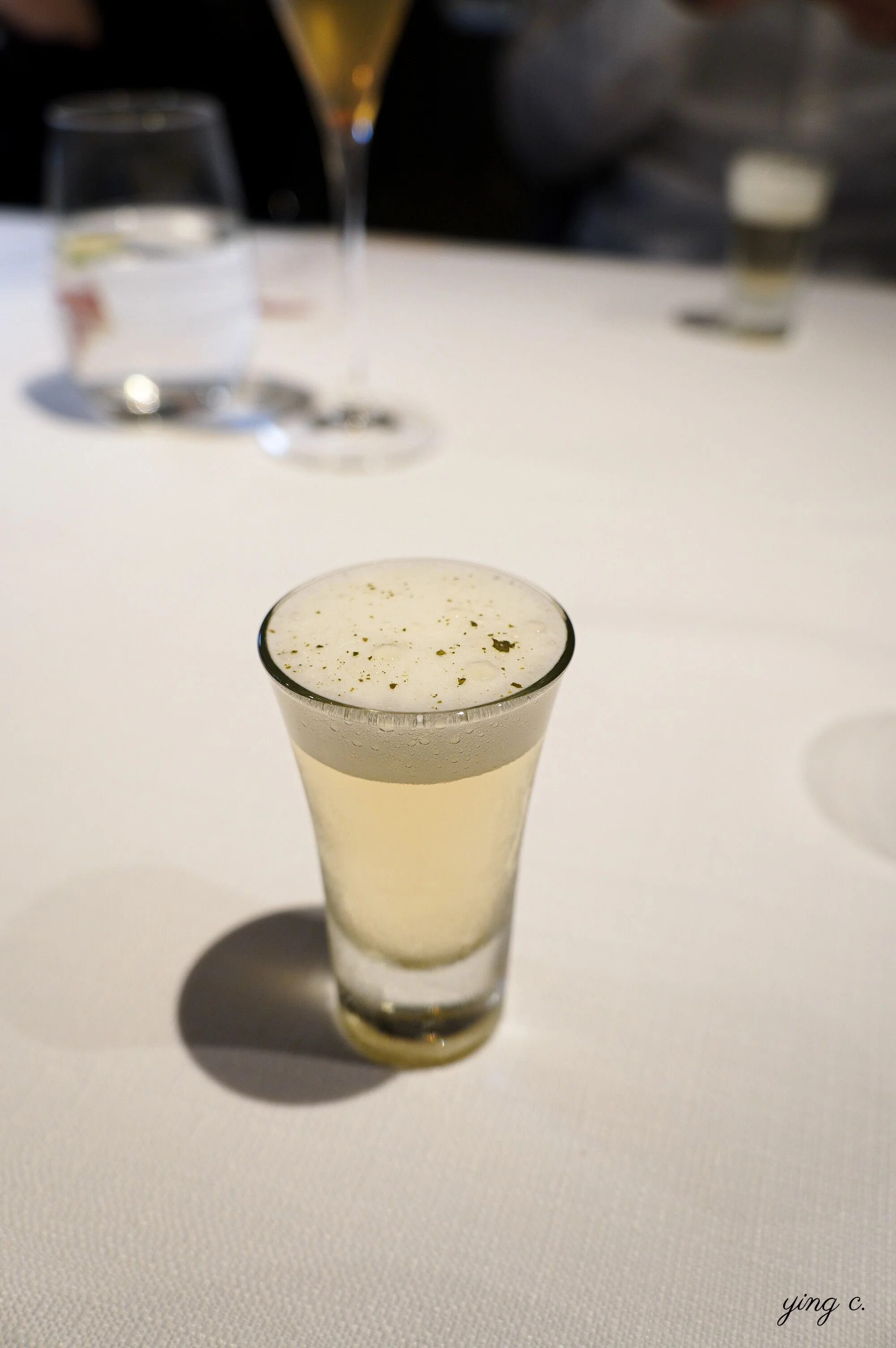冷凍甘蔗滴出澄清汁液、搭配檸檬泡泡,清新婉轉的風味,正好一洗前方濃烈的印象,進入套餐收尾階段。