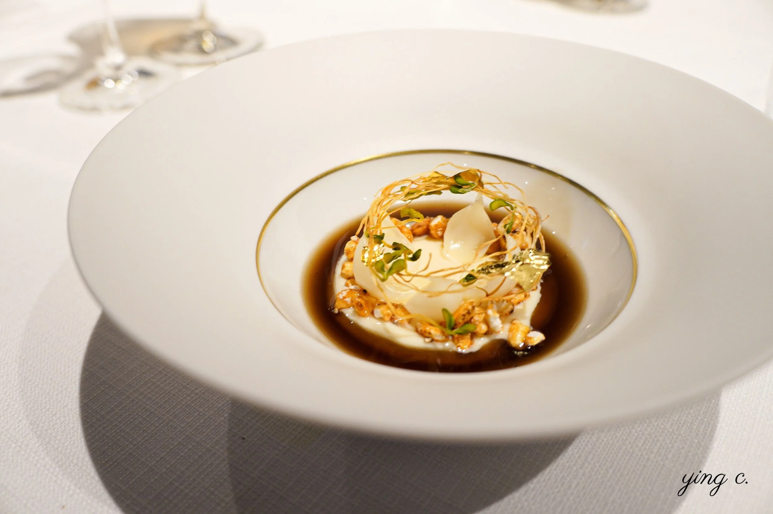 看到新聞稿中說明新加坡將「一勺仙草加一勺豆漿」的黑白雙色飲料稱為「Michael Jackson」時,同桌的朋友都不禁笑了。如此戲謔直白的命名,也說明這個飲品和台灣燒仙草、豆花一樣,都是正港庶民美食。然而,在兩位主廚的巧手下,這個在兩地皆隨處可見的飲品卻以極為婉約的姿態登場。豆漿被製成奶酪、加上鬆軟糯口的糖漬百合根、焦糖米香,並以先燙後烘烤脫水的綠豆芽花環與金箔裝飾。仙草醬汁則是溫熱後倒入,和冰涼的奶酪間產生的溫差對比,讓兩者形態瞬間向彼此靠攏,仙草凝凍、奶酪微化,若以此點題台星之間的交流,確實靈動非常。